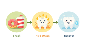 Each time we eat or drink something sugary or acidic, teeth go through an “acid attack.” If snacking happens all day, teeth have less time to recover.